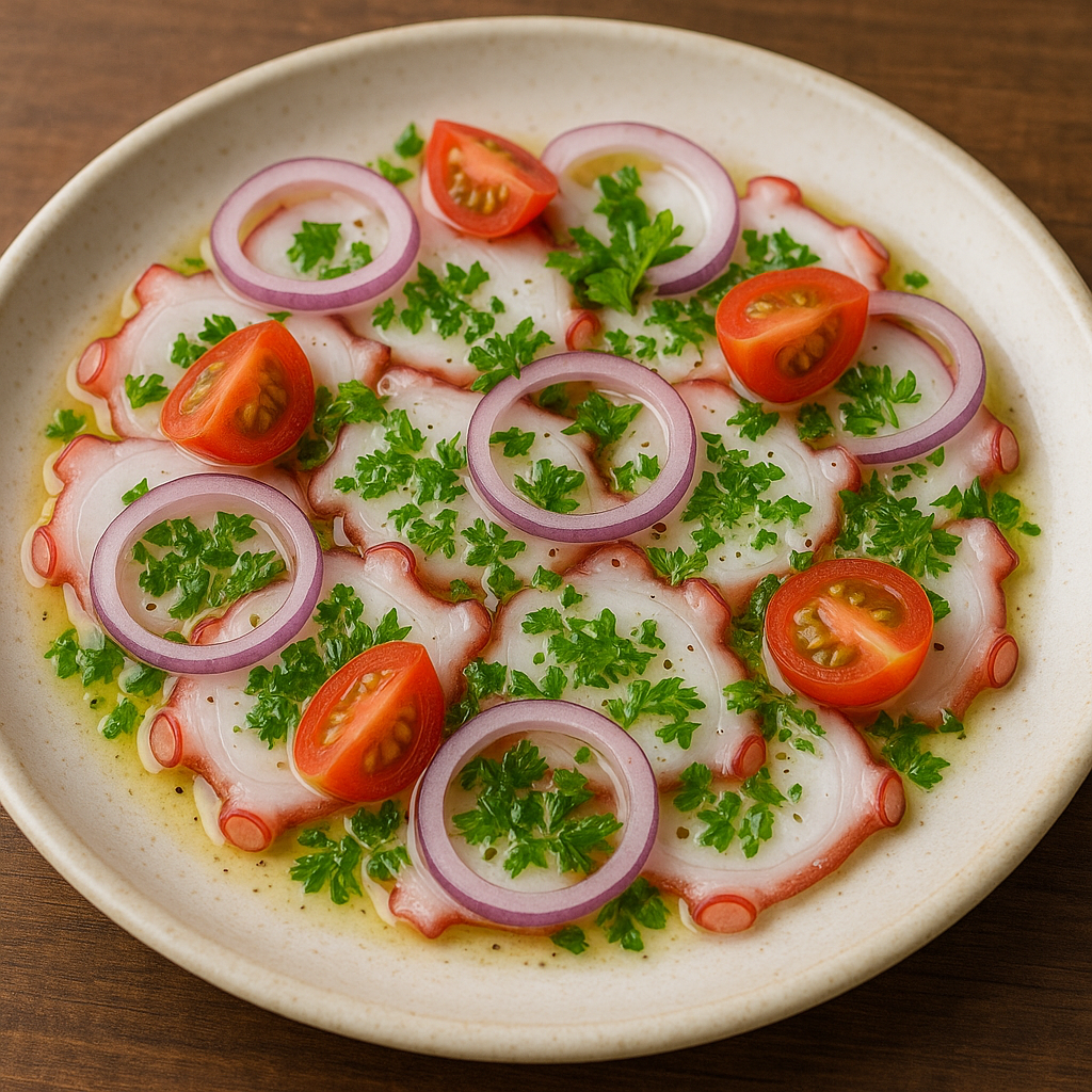 ① 浜茹で水ダコを半解凍にして、できるだけ薄くスライスします。刺身のような厚さが理想です。