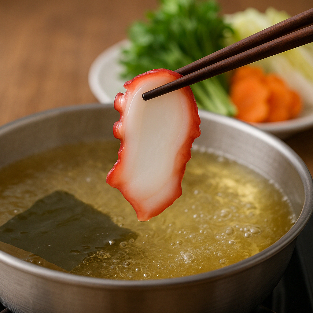 ④ 薄切りにしたタコを箸でさっとお湯にくぐらせます。数秒で十分、火を通しすぎると硬くなるので注意します。